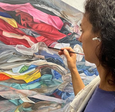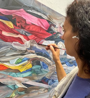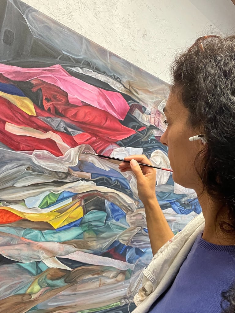 For several years now, I have been creating a series of oil paintings depicting compressed plastic waste. With these works, I aim to reveal the chaotic textures and vibrant colours of discarded plastics, inviting viewers to discover aesthetic value within environmental decay. This tension – between beauty and destruction, attraction and repulsion – forms the core of my artistic language.